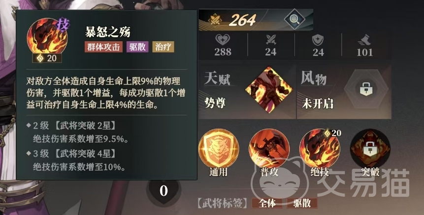 而董卓的绝技暴怒之殇则是一项强大的群体攻击技能,当他释放出暴怒之殇时,会对所有敌方目标造成相当于自身生命上限 9%的物理伤害,这一伤害数值随着董卓武将等级的提升而不断增加,在 2 级武将突破 2星时,绝技伤害系数能够增至 9.5%,当达到 3 级武将突破 4星时,伤害系数更是提高到了10%,除了高额的伤害输出外,暴怒之殇还附带驱散治疗的效果,每成功驱散敌方一个增益状态,董卓就能治疗自身生命上限 4%的生命值。