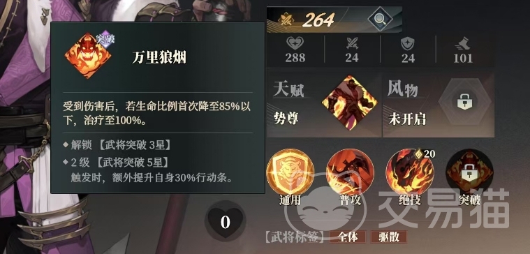 董卓的突破技能名为万里狼烟,这是一个极为强大的保命技能,当董卓受到伤害后,若他的生命比例首次降至 85%以下,此技能便会触发,将他的生命值瞬间治疗至满血状态,这一技能在危急时刻能够挽救董卓的生命,让他有机会继续在战场上战斗,而且在武将突破 3 星的时候就可以解锁万里狼烟技能,当董卓达到 2 级武将突破 5星时,触发万里狼烟技能时还会额外提升自身30%的行动条。