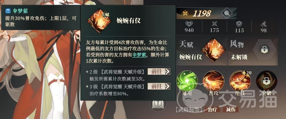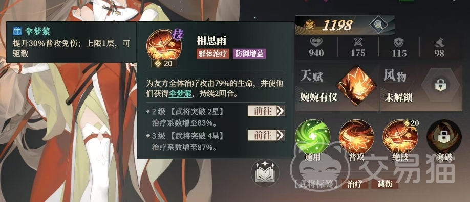 而她的绝技相思雨则更为强大,这是一个群体治疗与防御增益技能,当释放相思雨时,乔姝能够为所有友方角色治疗相当于自身攻击力79%的生命值,并为他们添加一个名为伞梦萦的增益状态,持续2回合,处于伞梦萦状态下的队友,其普通攻击免伤能力将提升30%,随着乔姝突破的提升,她的治疗效果也得到了进一步的增强,在2级武将突破2星时,她的治疗系数提升至83%,而当她达到3级武将突破4星时,治疗系数更是提高到了87%。