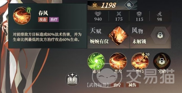 乔姝的普攻名为春风,这一技能不仅具备了攻击能力,还能为队友提供治疗效果,它能够对前排敌方目标造成80%的法术伤害,同时为生命比例最低的友方治疗相当于自身攻击力60%的生命值。