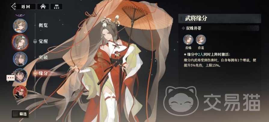 此外乔姝与乔菱之间还存在着一种特殊的武将缘分叫做枭之羁绊,当这两位武将同时上阵时,一旦激活这一缘分,缘分内武将在受到伤害时,自身每拥有1个增益,便能够提升5%的免伤效果,这一效果最多可以叠加至15%,也就是说当乔姝和乔菱一起上阵,并且在战斗中获得了多个增益状态时,她们在面对敌方攻击时,能够凭借这一缘分效果增强自身在战场上的生存能力。