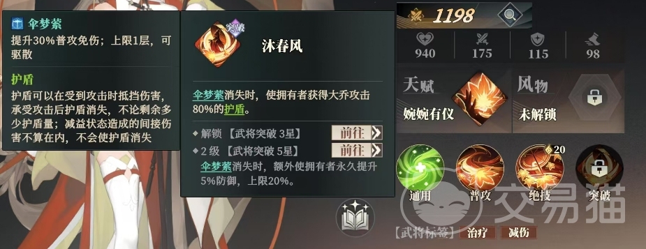 除了上述技能外乔姝还拥有一个独特的突破技能叫做沐春风,当带有伞梦萦的队友受到攻击导致该增益消失时,沐春风技能将触发,为失去增益的队友提供一个相当于乔姝自身攻击力80%的护盾,这个护盾能吸收大量伤害,且当乔姝达到2级武将突破5星时,沐春风技能在每当伞梦萦消失时,除了给队友提供护盾外,还会额外使拥有者永久提升5%的防御力,这一效果最多可以叠加20%。