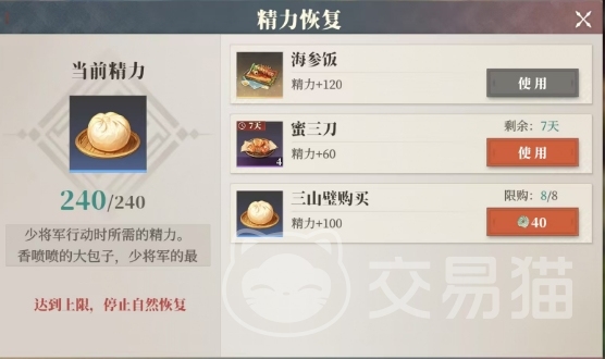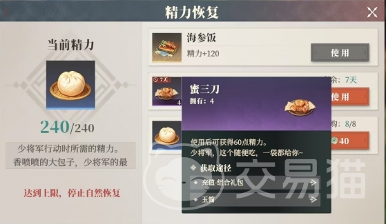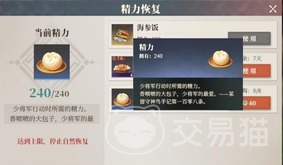 因为自动恢复数值的时间要很久,所以这里比较推荐大家用一些恢复道具,首先是海参饭,使用后可获得120点精力,可以充值组合礼包或者是玉简当中获取,当然体力值上限是240,多出来的会溢出,所以大家也要计算好足够的数值哦。