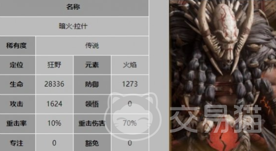 暗火拉什:这就是一个传说级别的火属性角色,拥有较高的防御能力,还有较高的战斗力。在攻击的时候,有几率直接给对方造成重伤伤害,战斗技能对于周围的敌人全部都会展开火焰群体攻击。