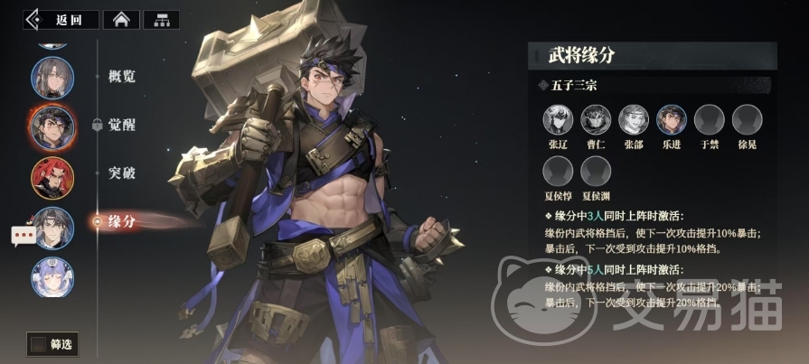乐进不仅自身实力非凡,更与五子三宗中的张辽、曹仁、张邰、于禁、徐晃、夏侯惇、夏侯渊等七位武将一起上阵会有羁绊,当其中三人并肩作战,缘分便悄然激活,为整个部队带来独特的战斗增益,每当武将成功格挡敌人攻击,其下一次出击将附带10%的暴击加成,而暴击之后又能让下一次承受的攻击带有10%的格挡提升。