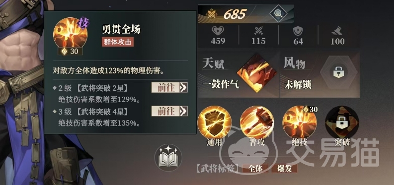 乐进的普攻悍击,会攻击敌方前排100%的物理伤害,乐进的绝技勇贯全场便有123%的物理伤害,带来的是敌方全体输出方式,随着乐进在武将的历练之路上不断突破,他的绝技也愈发锋利,2星突破后绝技伤害系数攀升至129%,4星之时更是达到了惊人的135%,随着乐进突破等级的不断提升,达到二星之时,他将迎来一次勇贯全场能力全面升级,不仅绝技伤害系数飙升,更赋予了他自身及同排友方的生命加成、攻击加成、防御加成均得到10%的全面提升。