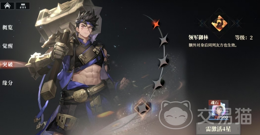然而当乐进最终达到最高的突破等级,他将解锁更为强大的领军御林效果,此时他不仅自身实力再攀高峰,更能将这份力量延伸至身后同列的友方,为他们披上一层无形的防御,尽管这一过程需要耗费高达500颗珍贵的魂石,但是因为这个角色出现的概率在抽卡当中还是很高的,所以大家就算没有刻意去养成这个角色,后期也是突破速度比较快的哦。