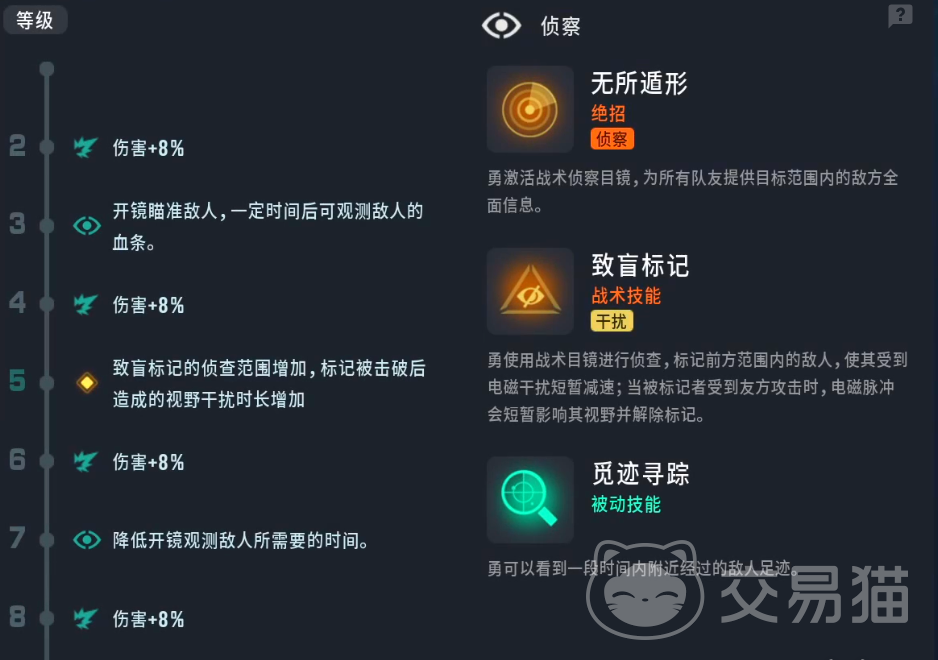 勇的被动是觅踪寻迹,可以看到近期内附近经过敌人的足迹,这个被动在战斗前探查敌方路线以及激战后追击残敌时帮助很大,能够尽快定位对手的轨迹,加上其他位置情报,可以做到提前伏击的妙用。战术技能是致盲标记,使用战术目镜标记前方敌人,让对手受到电磁脉冲的干扰,不仅减速而且会丧失部分视野。大招则是无所遁形,主动激活战术目镜,同时为全部队友提供范围内的敌人标记信息。这一技能非常关键,在进攻撤退中能够让全队掌握更多战局信息,准确报点,再加上核心输出角色的高伤可以尽快让对手减员杀伤。