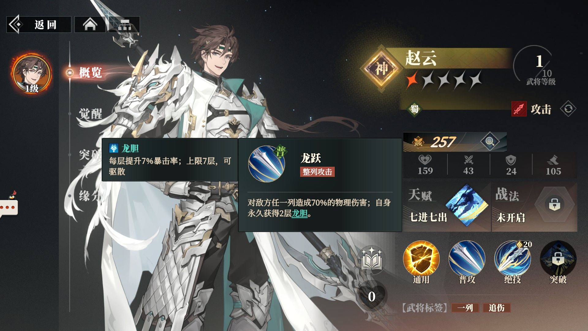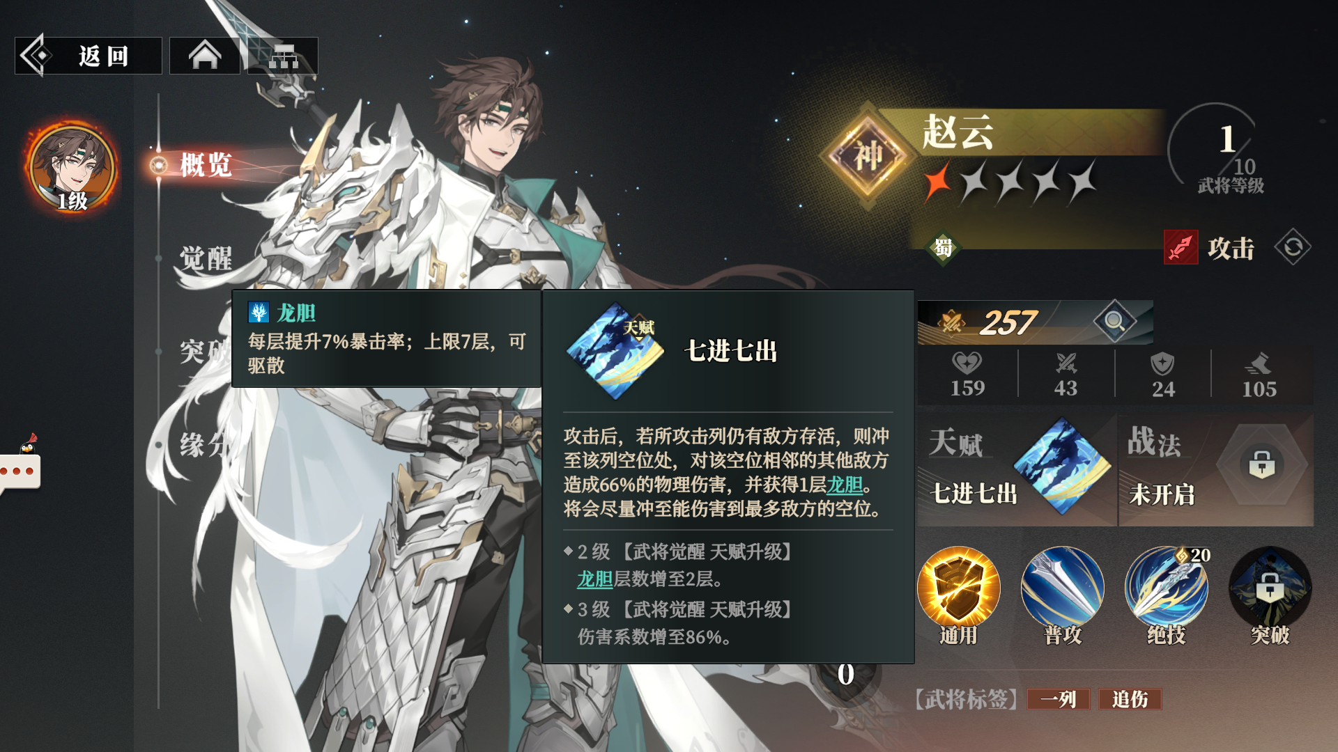 龙胆带来效果每层提高他7%的暴击率,累积上限7层;升到2级时,龙胆层数提高到2层;3级时伤害系数增强到86%。普通攻击“龙跃”,可对任意一列的敌方单位造成70%物理损伤,自己永久获得2层龙胆。