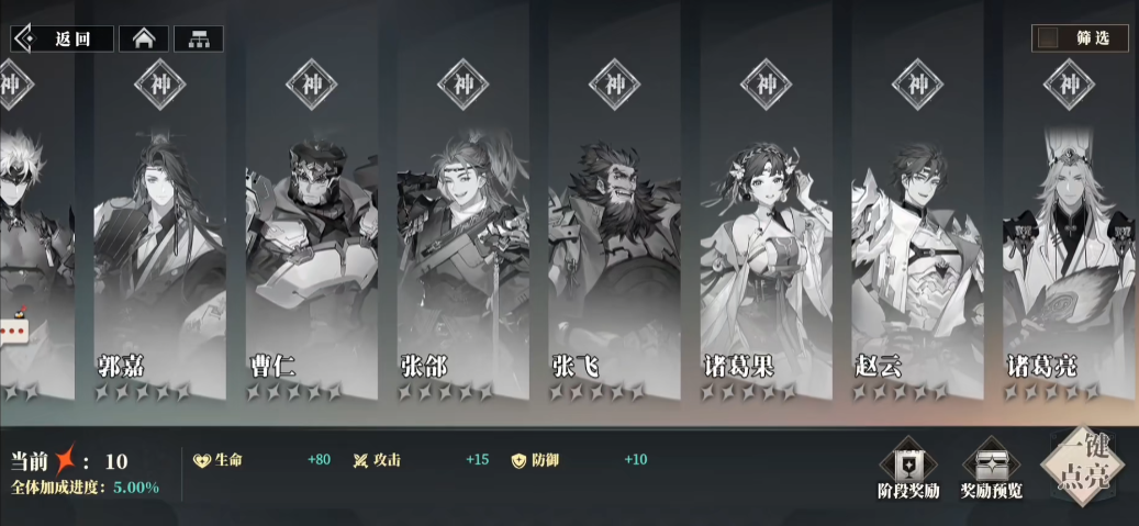 突破技能“豪龙断星河”,在自身回合进行攻击、或在敌方回合承受攻击时,能让自己的行动条提高10%;武将突破5星时将获得自身回合开始时,驱散1个减益效果。