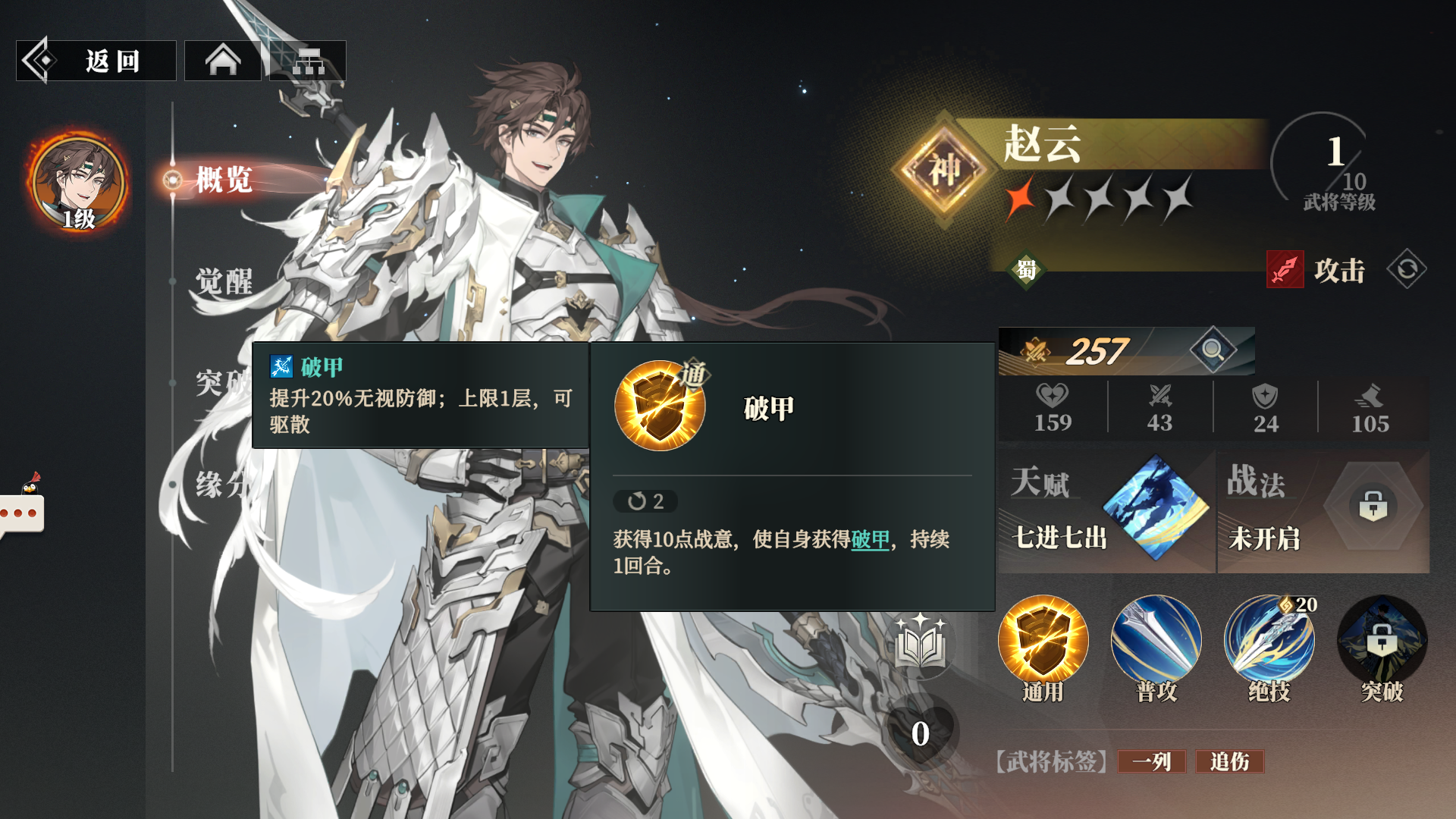“破甲”的通用效果,能提高自身20%无视防御,同时获得10点的战意。绝技“豪龙翱翔”,能对任意一列的对手打出139%的物理伤害,每拥有一层龙胆,能提高本次技能5%的暴击伤害;2星时伤害系数增至146%;四星时大招伤害提升到153%。