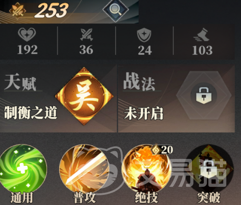 孙权的天赋是制衡之道。回合结束的时候可以永久获取1层经略,在拥有3层的时候将会全部消耗掉来提升我方的行动条10%。2级则是让消耗的经略层数便为2层。3级行动条增加为15%。
