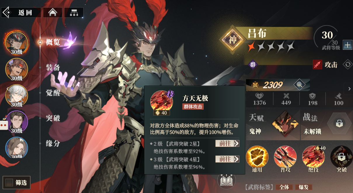 他的绝技“方天无极”会对敌方全体造成88%物理输出值,对生命比例高于50%的敌人,本次伤害将提升100%,绝技升到2级会让伤害系数增加至92%,升到3级会让伤害再增到96%。