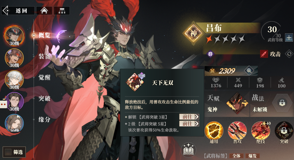 他的突破技“天下无双”会在每次释放完绝技后,用普攻攻击当前生命比例最低的敌人,将该技能升到2级,还会让普攻额外获取到50%的生命汲取,增加自身一定的生存能力。