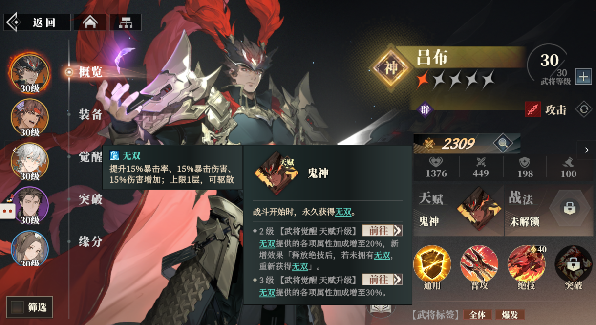 吕布的天赋“鬼神”会在战斗开始时,永久获得“无双”效果,“无双”能提升他15%暴击率、暴击伤害和伤害增加,上限为1层可被驱散,将天赋升到2级“无双”提供的各项属性将增加到20%,并且在之后释放绝技时,若身上没有“无双”,则再次提供,3级会让“无双”各项增益增加到30%。