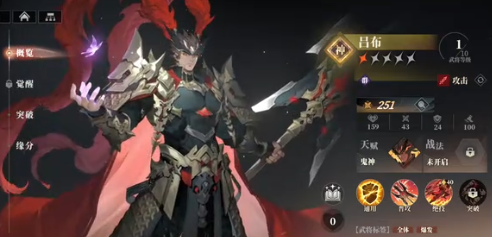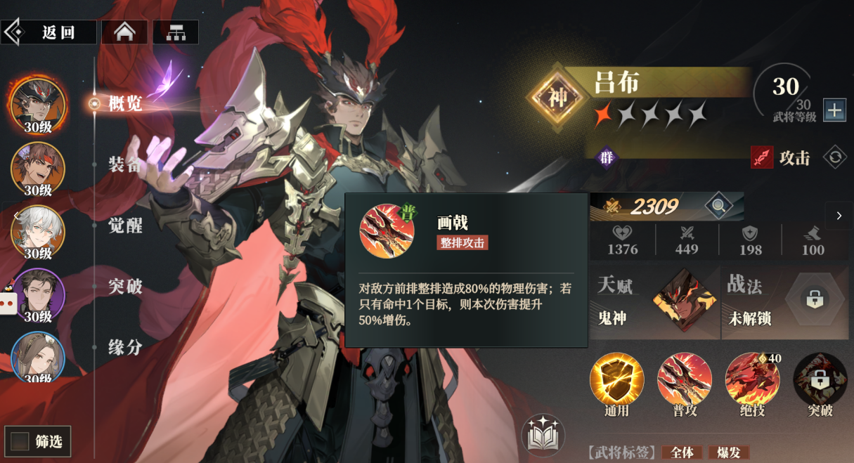 他的普攻“画戟”会对敌方的前排形成80%物理伤害,若只成功命中1个目标,则本次伤害将提升50%,他的通用“破甲”会得到10点战意值和持续1回合的破甲效果,破甲能无视敌方20%防御,不可以叠加可被驱散。