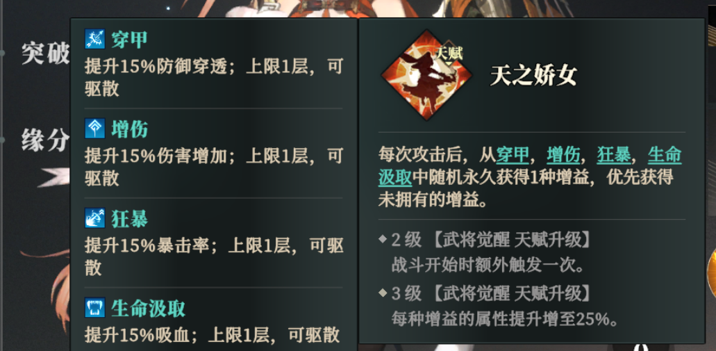这里就得提到孙尚香的天赋“天之骄女”了,每一次攻击后都可以从穿甲、增伤、狂暴、吸血中永久获得1个增益,优先获取没有拥有的增益,除了吸血都可以提供直观的输出增益,因此孙尚香也是属于越战越强的武将。