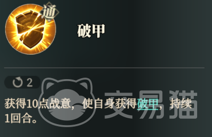 乐进的通用技能是破甲,这个技能可以让乐进自身获取到10点战意,同时获取到1回合的破甲,破甲的能力可以让其无视20%的防御,此技能上限1层,可以被驱散掉。他的普通攻击可以对前排的单位造成100%的物理伤害。