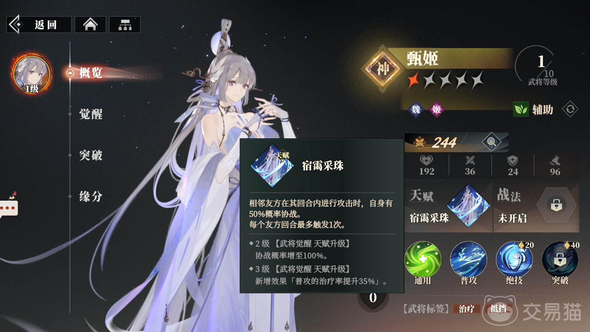 天赋效果“宿霭采珠”,当相邻的己方队友在对应的回合内展开攻击时,她自己则获得50%的几率能进行协同战斗,每个队友回合最多触发一次;武将升级后,2级时协战几率增加到100%;3级时会新增一个效果,普攻的治疗率得到35%的提升。