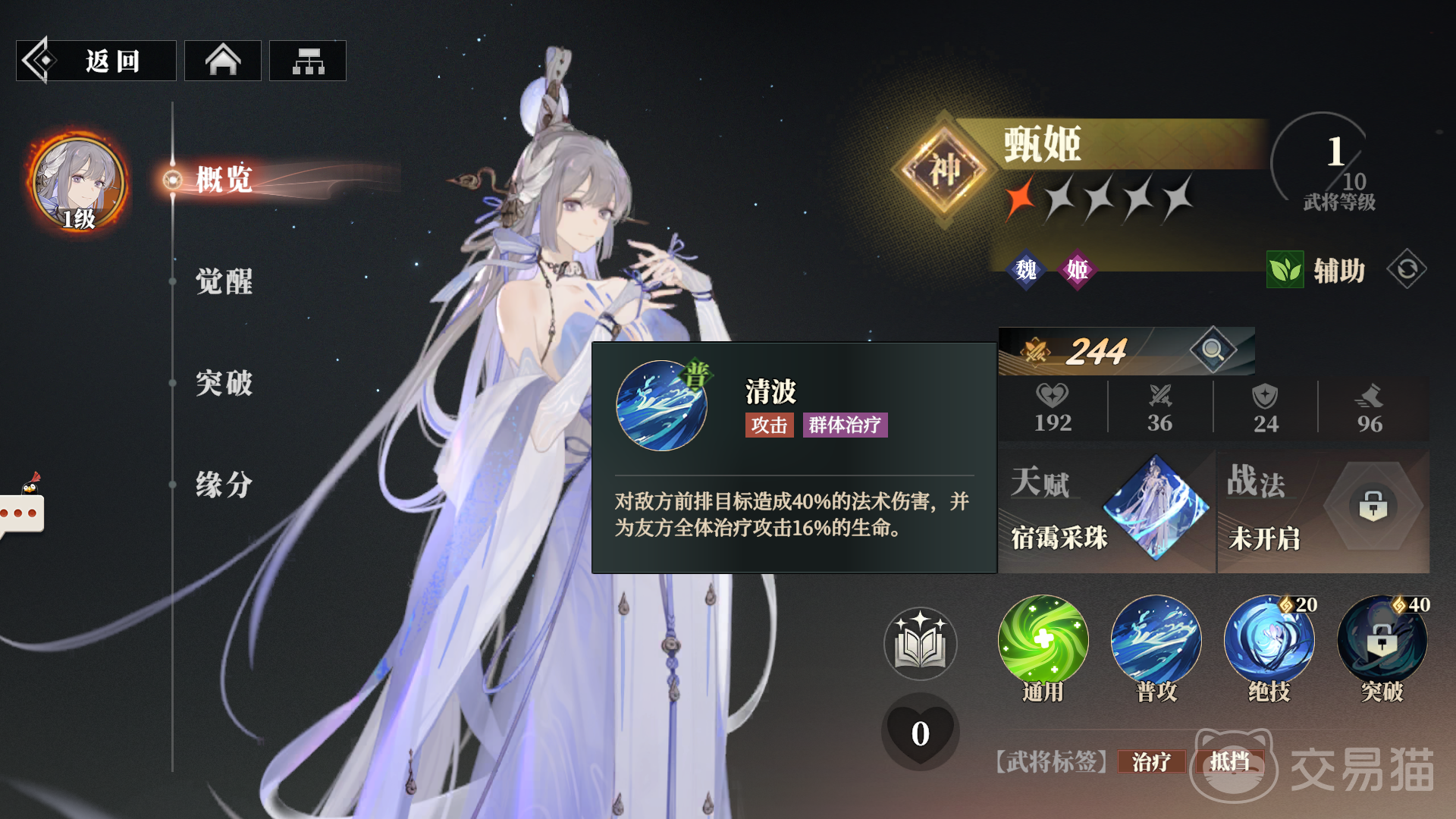 通用效果“复苏”,让她获取10点战意,并让己方队友获得复苏效果。普通攻击“清波”,会让敌方前排单位受到40%的法术伤害,并给己方全体队友展开治疗,治疗效果是自身攻击力16%的生命值。