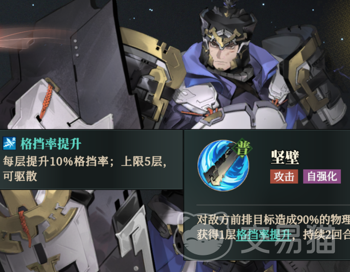 曹仁的普通攻击是坚壁,此攻击是对敌方的前排目标造成90%的物理伤害,同时可以获取到1层的格挡率提升。这个能力是每层可以获取10%的格挡率,上限是5层,可以被驱散,持续时间两个回合。