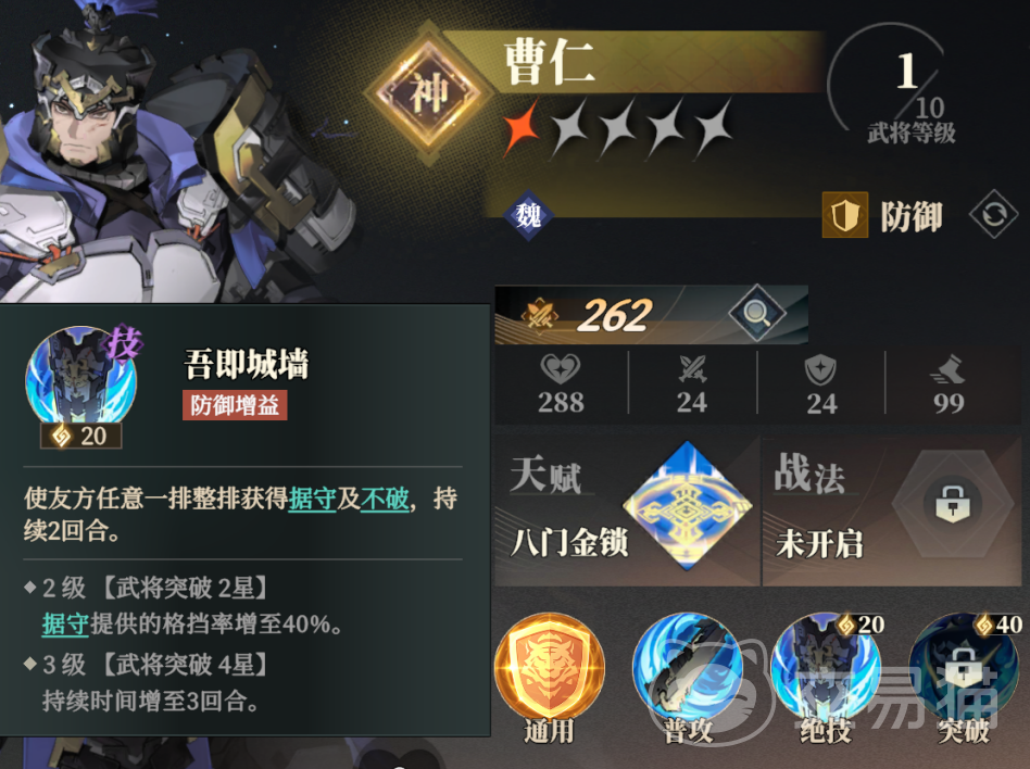 在达到3星后可以获取到固若金汤,这个技能是让友方的目标获取到固若金汤的能力。此能力是受到直接伤害的时候该次伤害不超过拥有者生命上限10%,此效果无法被驱散。2级的时候冷却减少1秒。曹仁天赋是八门金锁,战斗开始的时候施放,对于每一名友军单位来说,每有一个相邻友方都可以获取6%的免伤。2级可以增加到10%免伤。3级则是14%。