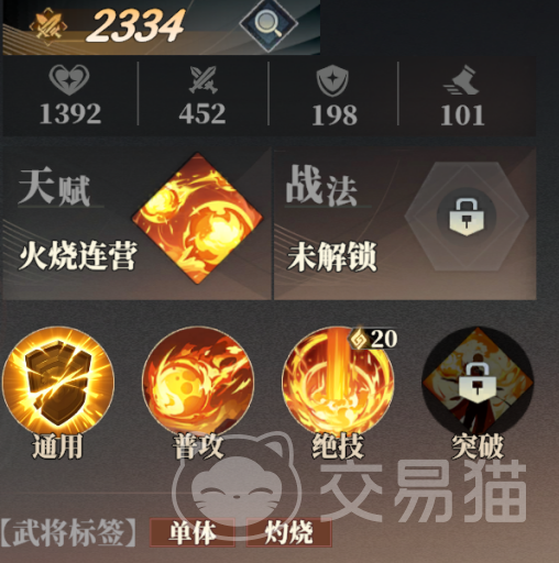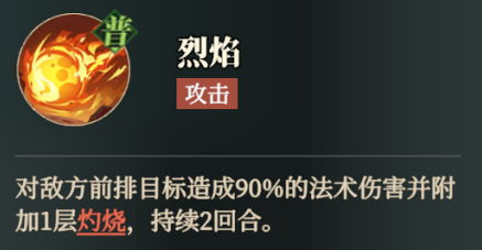 他的普攻是烈焰,这个攻击是对敌方的前排目标造成90%的法术伤害并附加一层灼烧。灼烧在每一回合开始的时候可以造成攻击者30%的法术间接伤害,上限20层,可以驱散,持续2回合。
