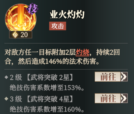 陆逊的大招是业火灼灼,对敌方的任一目标附加两层灼烧,持续2回合,然后造成146%的法术伤害。2级则是将伤害给提高到153%。3级则是提高到160%。