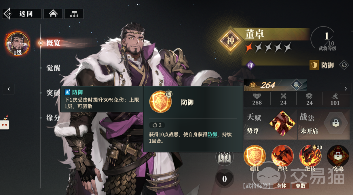 董卓的通用“防御”会让自身得到10点战意值,并获得持续1回合的防御效果,该效果能在下一次受到攻击时额外拥有30%免伤,上限一层可驱散,他的普攻“暴虐击”会对敌方前排目标形成70%物理输出,并且此次攻击有100%的生命汲取。