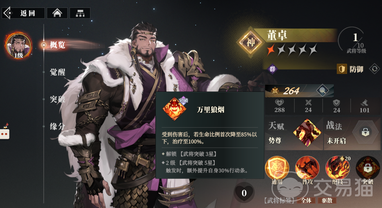 他的突破技“万里狼烟”会在遭受到伤害后,如果生命比例首次降低到85%以下,就将自己直接治疗到100%,突破技升到2级后会在触发时,额外提升自己30%的行动条。