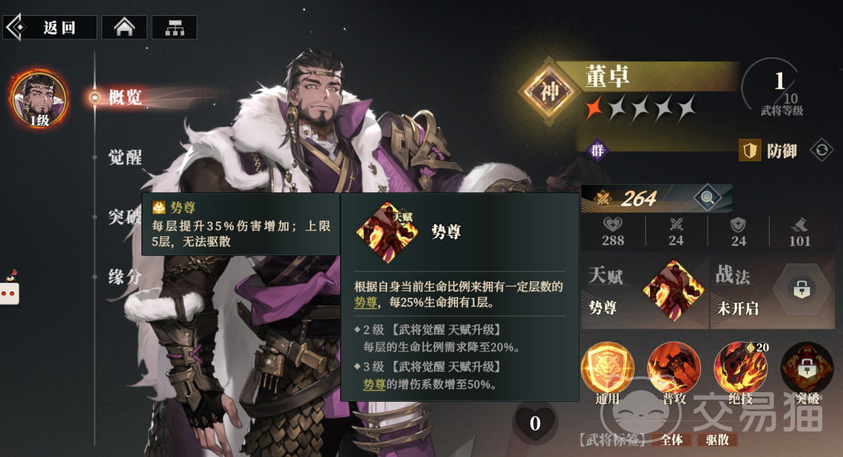 他的天赋“势尊”会根据当前生命比例拥有一定层数的势尊,具体为每25%生命拥有1层,该效果能让伤害增加35%,上限是5层敌人无法驱散,天赋升到2级会让每层对生命比例的需求降低到20%,3级会让势尊增加的伤害提升到50%。