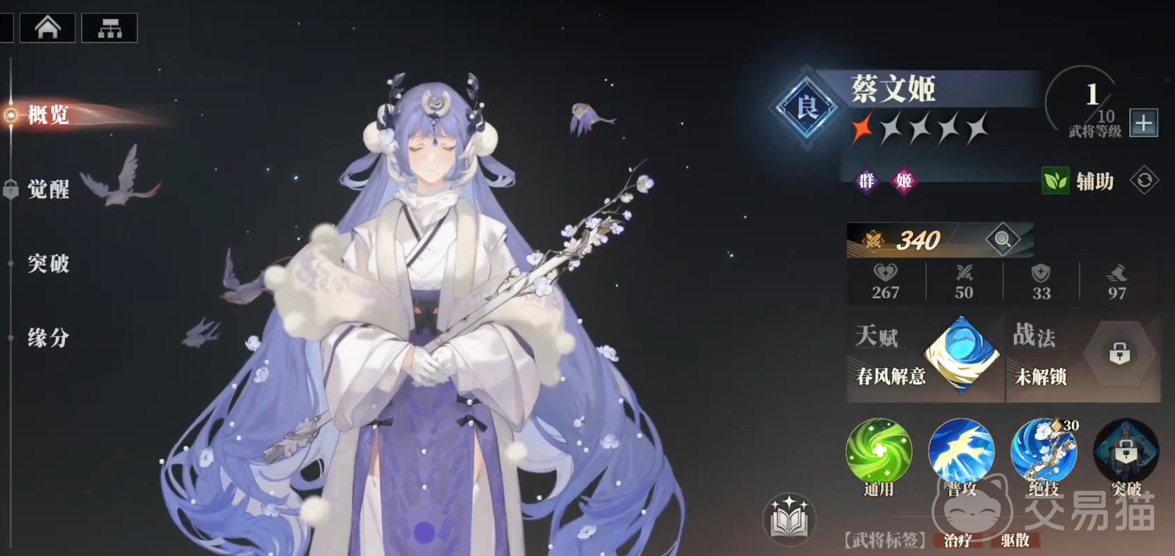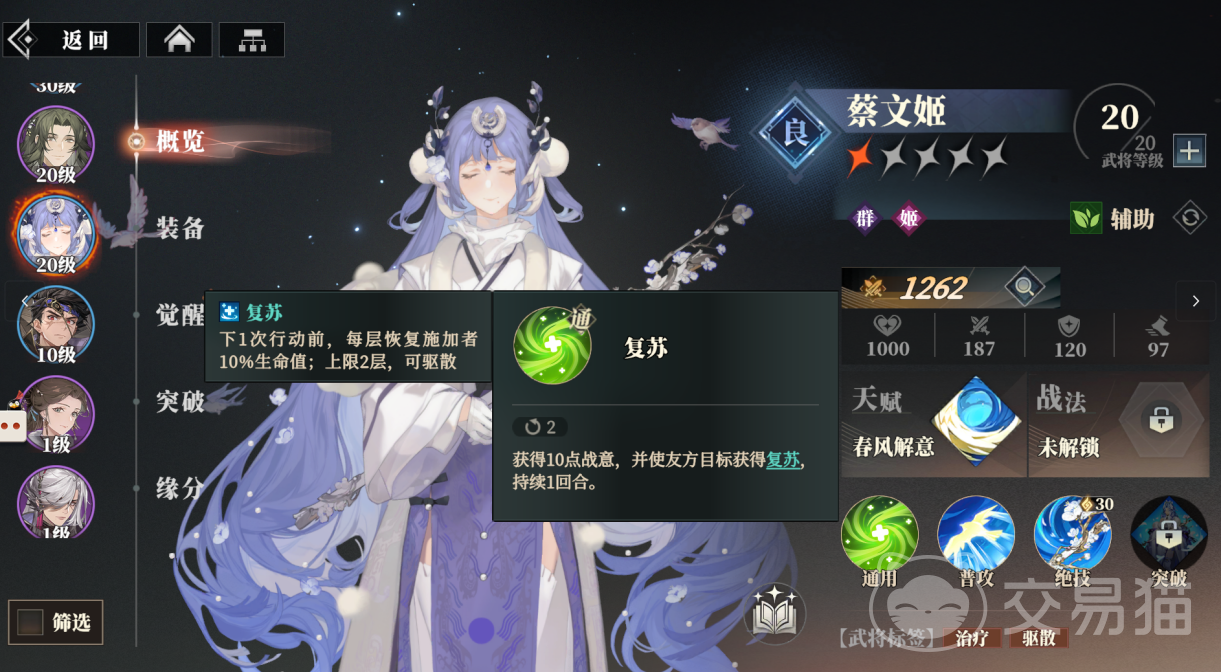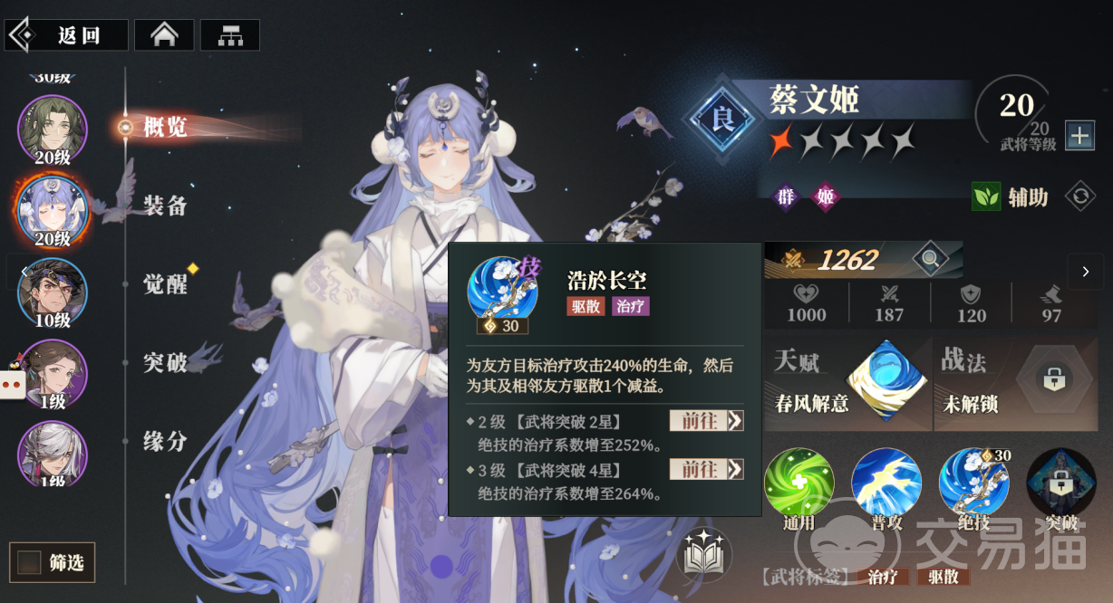 三国志幻想大陆2枭之歌蔡文姬虽然只是良将角色,但是技能机制却十分好用,可以为队友带来伤害减免和治疗,还能帮助驱散减益和控制,在面对一些敌人时能发挥出意想不到的作用。