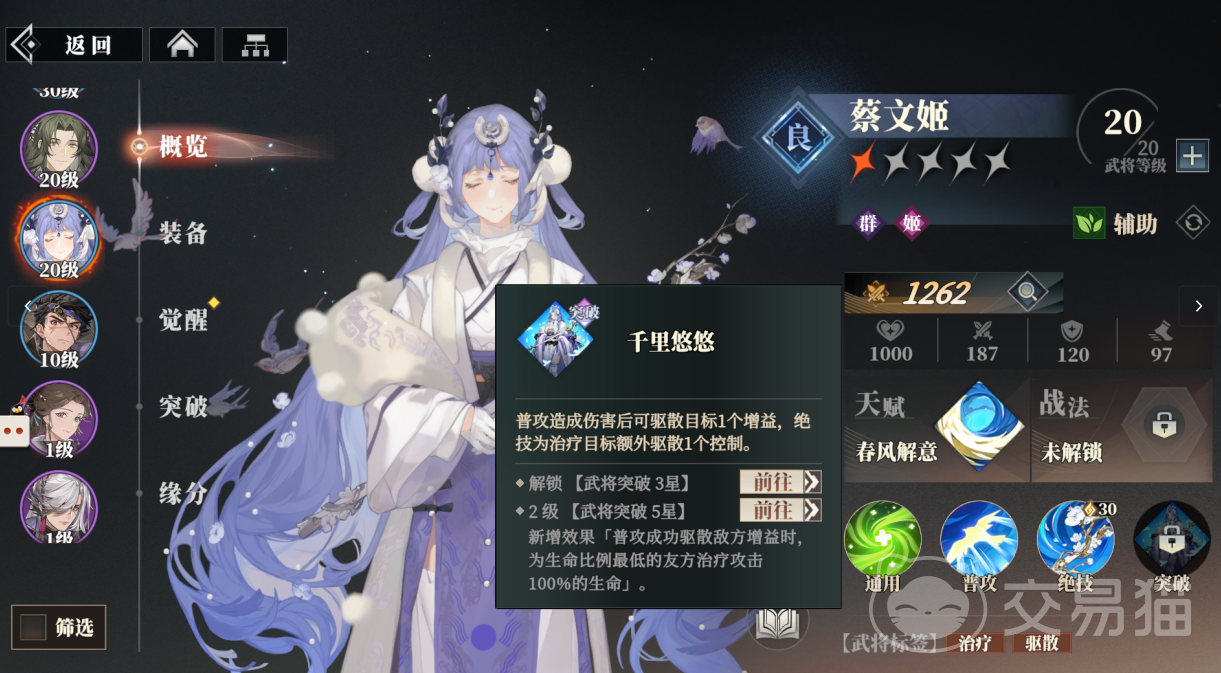 她的突破技“千里悠悠”会在普攻形成伤害后,驱散该敌方目标一个增益,并且绝技为治疗的目标额外驱散一个控制,突破技升到2级会新增一个效果,在普攻成功驱散敌方增益时,为生命比例最低的队友治疗攻击100%的生命。