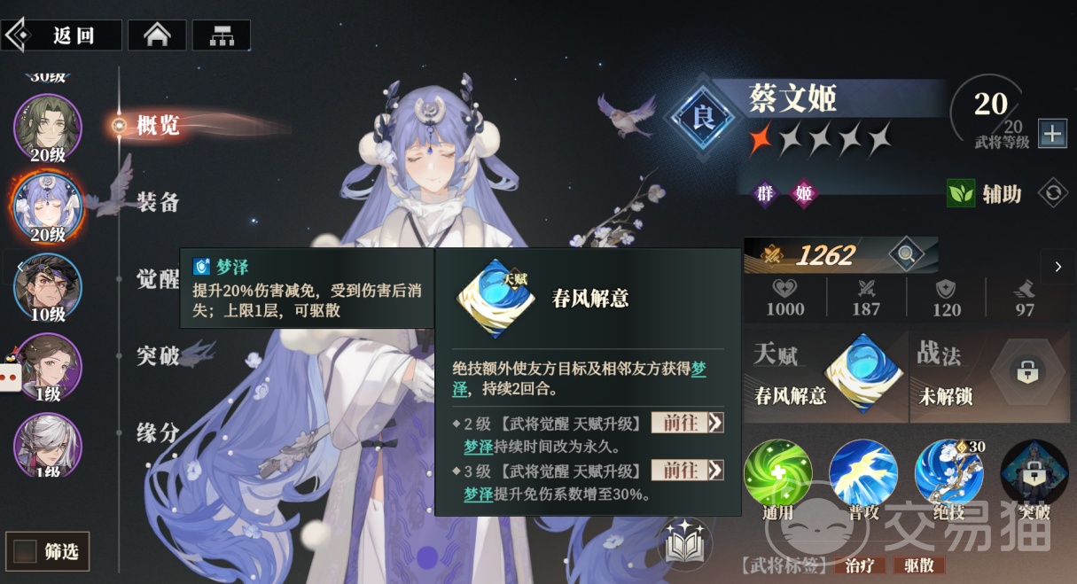 她的天赋“春风解意”会让绝技额外让一位队友和相邻友方获得持续两回合的梦泽效果,梦泽能带来20%的伤害减免,受到伤害后会消失上限为1层可被驱散,天赋升到2级会将梦泽持续时间改成永久,3级会让梦泽的伤害减免提升到30%。