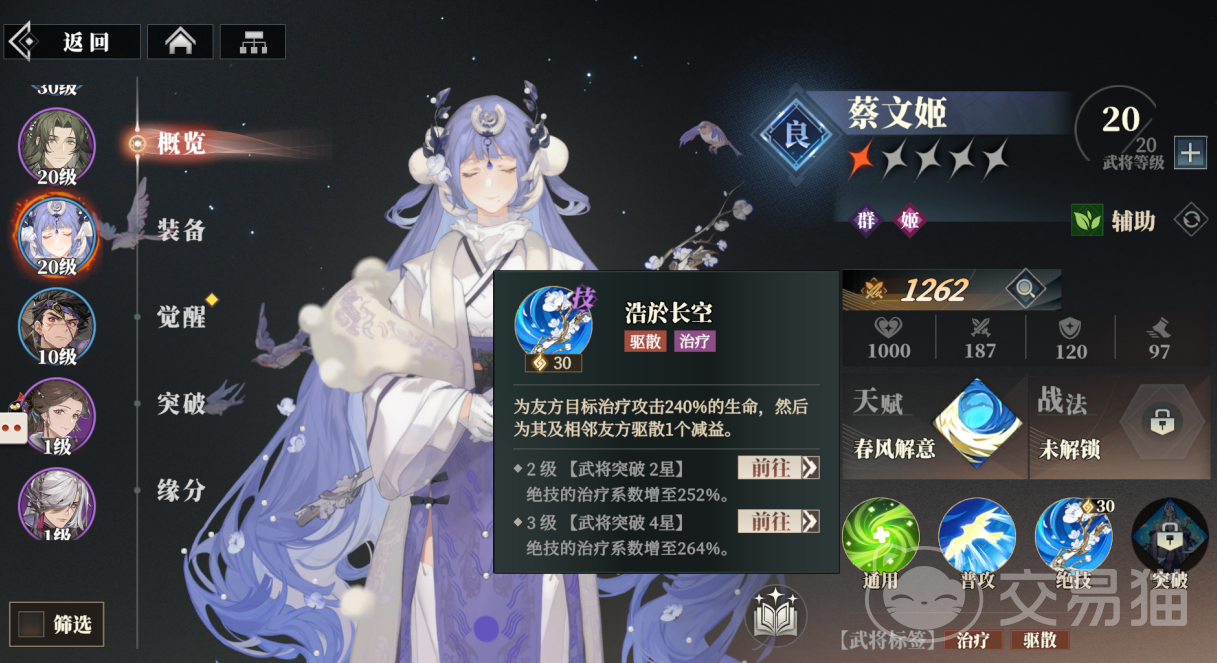 蔡文姬属于治疗,绝技能帮助一位队友治疗攻击240%生命,并且还会为其和相邻队友驱散掉1个减益,孙开朗可以作为前排使用,他的天赋能在生命比例首次降低到50%以下是,永久得到山岚提升30%物理免伤,绝技能对敌方目标进行3段攻击,每段形成38%输出值,驱散掉目标1个增益的同时治疗自身生命上限20%的生命;