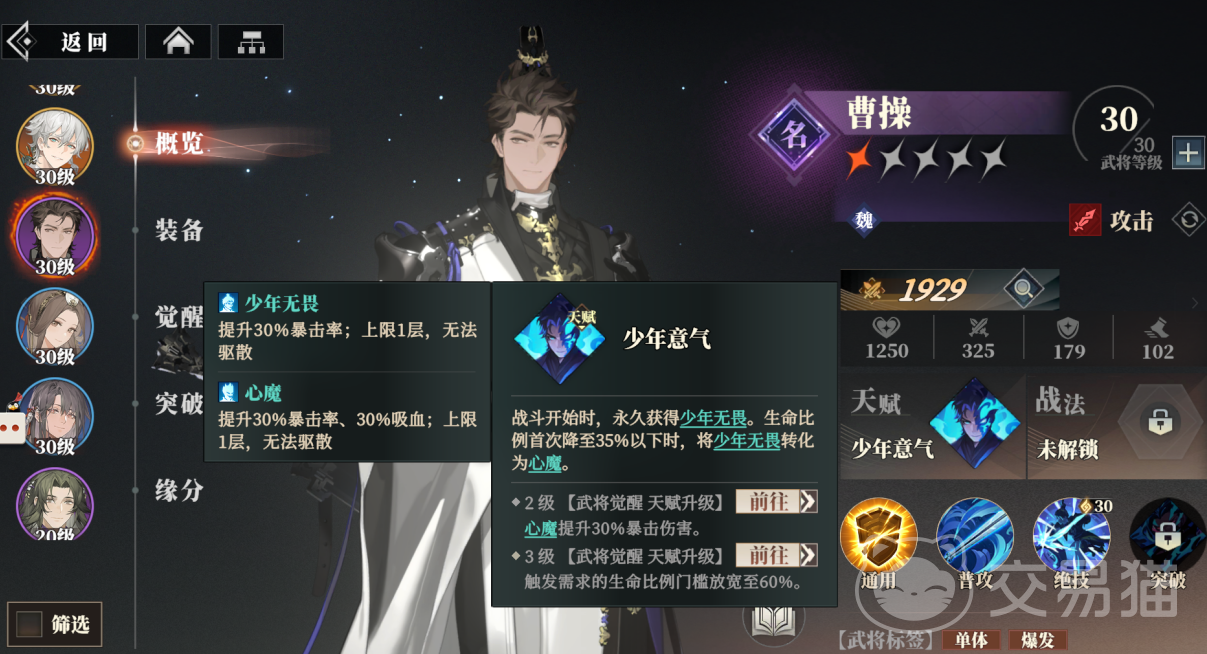 新手初始阵容推荐曹操、蔡文姬、孙开朗和甘宁,剩下两位可以根据自己新手池中抽出的橙将情况直接加上,曹操是强大的单体输出,天赋能在战斗开始时永久得到提升30%暴击率的少年无畏,生命比例首次降低到35%以下的时候还会将该效果转化成心魔,变为提升30%暴击率和30%吸血,绝技则是对敌方单体进行2段攻击,每段形成118%物理输出值,如果目标生命比例高于自身还会增加10%的伤害;
