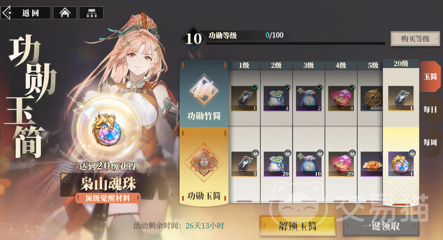 如图所示,主界面左下角的目录中就有【玉简】,可以将其简单视作一个战令,玩家完成每日任务、每周任务都可以获得功勋值。每天达到140点功勋值可以得到对应的不同阶段的奖励。