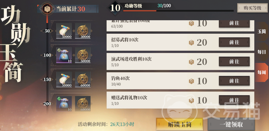 每周任务也有对应的奖励,累计300功勋值有不同的阶段奖励。功勋值的提升还可以提升功勋等级,当功勋等级达到特定顶级就可以获得“功勋竹简”奖励,也就是手游里比较常见的常规战令奖励。