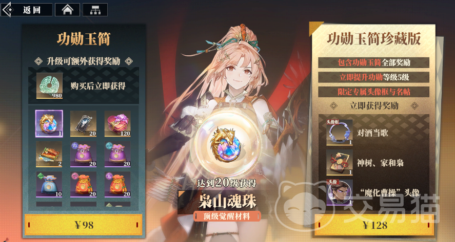 除了基础玉简外,还有功勋玉简和功勋玉简珍藏版,需要氪金购买,前者98元,购买后可以立刻获得980的三山壁还有一系列的资源奖励,包括一个天赋升级材料“枭山魂珠”和20个常驻抽,以及礼物盒、精力、养成材料等等。