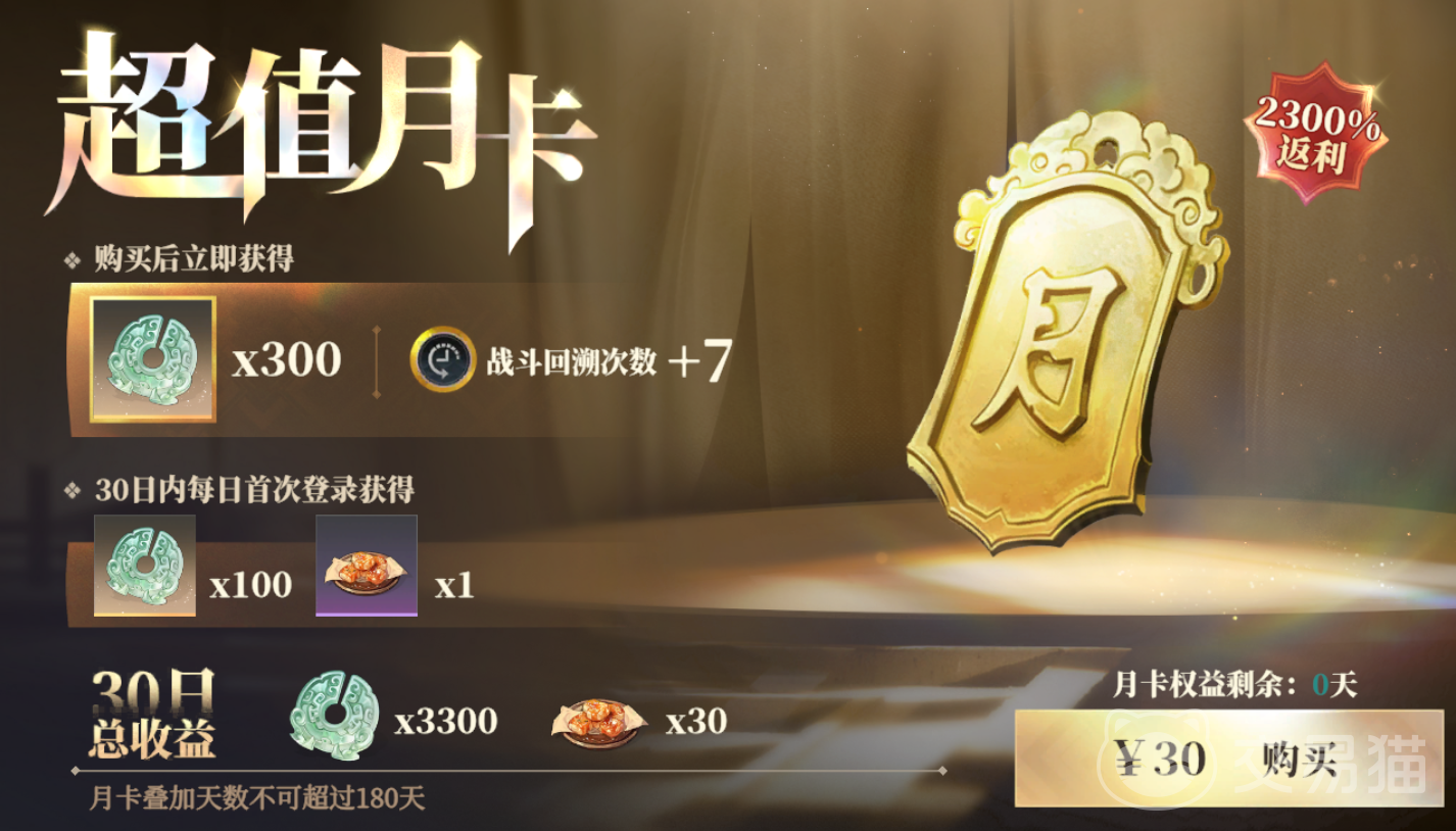 4、超值月卡,月卡的售价还是比较划算的,30元即可购入,主要的资源有玉露花,三山壁,以及常驻池的抽卡道具,想要快速获得强力武将比较建议购入;5、限时累消,这个也是看大家充值的额度能领取对应奖励的。