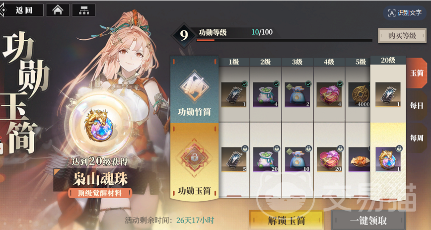 1、功勋玉简,这个氪金的项目有点类似于战令,分为两种不同的类型,一种是比较基础的,这种是跟随大家游戏的进度能免费解锁并获取其中的资源的,而下面的一种则是需要氪金才能领取对应等级奖励的,这里面主要是武将成长的各种资源材料,氪金的能领取到的材料数量会更多,能更快的帮助角色成长。