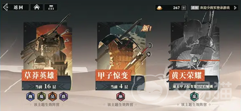 装备:武将的成长,必然离不开装备的加持,可通过“兵械库”来获取不同的装备,兵械库由三个主题,“草莽英雄”,“甲子惊变”,以及“黄天荣耀”构成,三个主题生效的阵营是不同的,其实就是三种类型的装备塔,可从其中获取橙色装备,无双装备,可将对应装备给合适的武将使用。