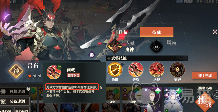 这里给出的建议是,尽量用普攻是单攻的武将,尽量不要用群攻,比如说吕布、典韦这种武将就不太适合,他们的普攻都是对一排敌人造成伤害,这时候可以考虑使用他们的通用技能,就是给自身增伤或者减伤的技能。