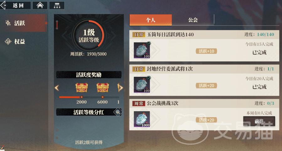游戏里大家需要注意的会重置的主要有玉简每日任务,并不一定要全部做完,但最好是拿到140点的每日累计功勋值,这样保底能有80个三山壁。然后就是公会活跃度,每天完成玉简日常、参与封地经营、公会挑战就可以获得公会分红,这个分红也是每天凌晨5点刷新的。