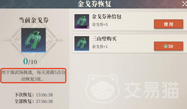 然后就是竞技场,以演武场为例,挑战对手需要消耗“金戈券”,这个券也是每天凌晨5点自动恢复5张,最多保存10张,建议大家每天都去挑战一下,能打得过最好,打不过也要把券消耗掉。