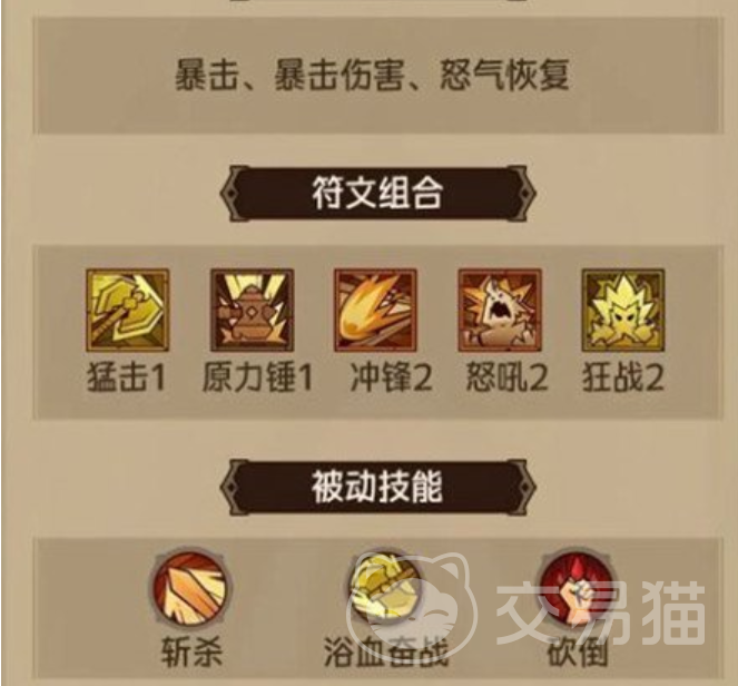 然后就是锤子的技能选择,主动选择地狱火原力锤,该技能在释放的时候可以周围造成范围性的伤害,而且对单体的压制能力也强,可以短时间打出极高的爆发能力,而被动技能携带战争怒吼以及或冲锋,战争怒吼可以提升角色的暴击属性,而冲锋能直接接近对面,直接强化了角色的总站能力。