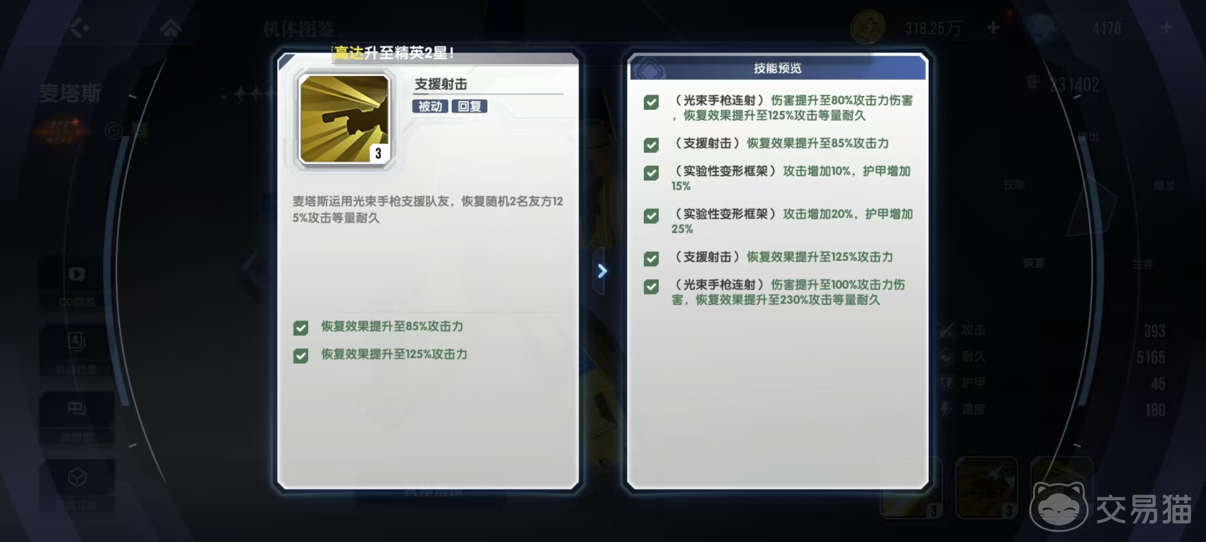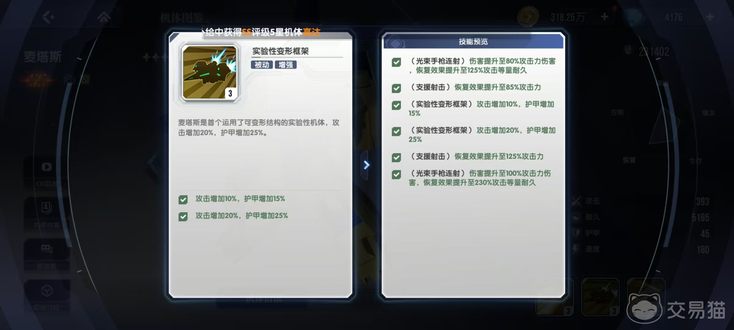这个技能在伤害方面尚在其次,不过可以恢复大量耐久值是防止减员的重要手段。接下来是第1个被动技能实验性变形框架,因为麦塔斯是首个运用了可变形结构的实验型机体,所以它的攻击增加20%,护甲增加25%。在被动技能中这并不属于非常有优势的一个,中规中矩。