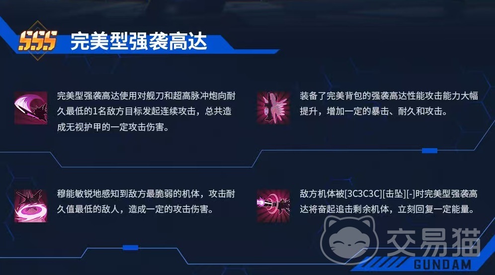 因为自身装备了翔翼,巨剑,重炮三种突击背包技能,所以能适应各种战斗环境,必杀技和重击可以对敌方耐久最少的敌人造成无视护甲伤害。第1个技能是使用超高脉冲炮和对舰刀,向耐久值最低的一名敌方目标发动连续攻击,造成高额无视护甲伤害。第2个技能大幅度提升了该机体的暴击、耐久和攻击属性。第3个通过感知敌方最脆弱的机体,选择攻击耐久值最低的敌人造成攻击伤害。第4个技能在敌方机体被击毁时,完美型强袭高达将奋起追击剩余机体,并立即恢复一定的能量。