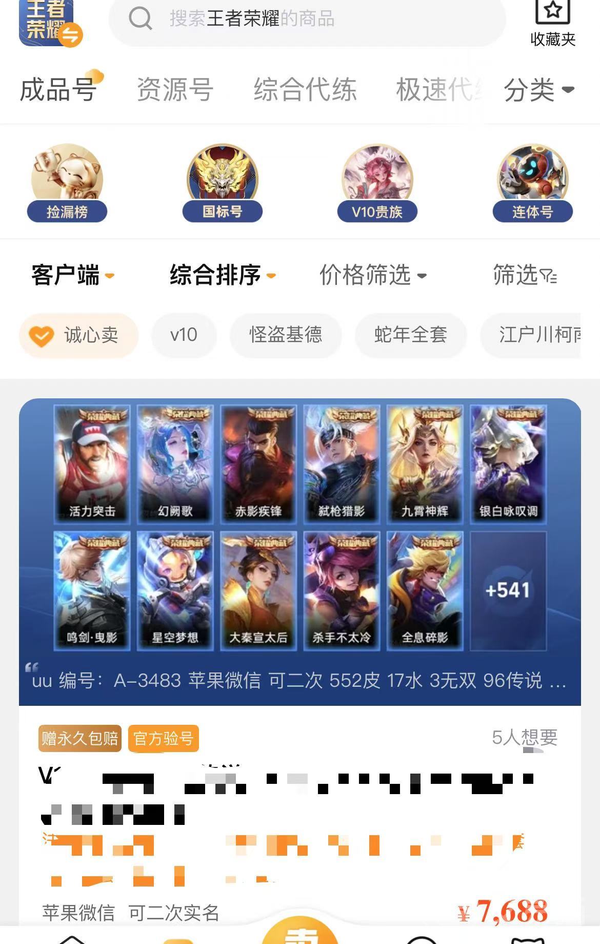 同样,在交易猫卖掉500个皮肤的王者号也是相当容易的,交易猫的用户特别多,这就意味着,你要是在交易猫上卖王者荣耀账号,曝光率超高,很容易就能快速卖出去。不管是英雄全满、皮肤全有的顶级账号,还是那种有特殊限定皮肤、都能在这找到想买的人。