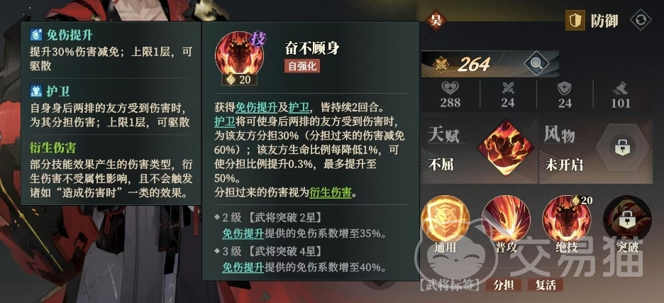 而且如果该友方的生命比例每降低1%,那么分担比例还会额外提升0.3%,最多可以提升至50%,此外免伤提升也是奋不顾身技能的一个重要组成部分,它能够为周泰提供30%的伤害减免,并且这个效果可以叠加一层,但可以被驱散,随着武将突破等级的提升,周泰的能力还会进一步增强,例如在2星突破时,免伤提升提供的免伤系数将增加到35%,而在4星突破时,这个数字将上升到40%。